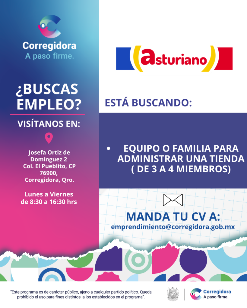 Si te interesa la vacante manda tu CV a «emprendimiento@corregidora.gob.mx» y adjunta tu INE por ambos lados.