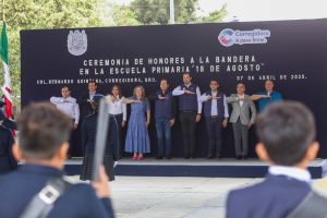 El presidente municipal de Corregidora, Chepe Guerrero, junto con las y los integrantes del Gabinete Municipal, asistió a la Ceremonia de Honores a la Bandera en la escuela primaria “18 de Agosto”, donde entregó 15 equipos de cómputo con el propósito de equipar un aula que permitirá a las y los estudiantes adquirir los conocimientos necesarios en el ámbito de la tecnología.