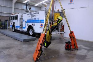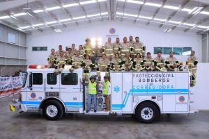 Se trata de un camión americano que cuenta con torre de iluminación a control remoto, 3 escaleras de 10, 16 y 28 pies; 4 equipos de respiración autónoma, equipos de rescate vertical y acuático, canastilla para rescate en alturas, sistema de espuma y una bomba de agua con capacidad de al menos 1,200 galones por minuto, lo que permitirá hacer frente a incendios de gran magnitud.