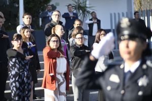 En el marco de la ceremonia de honores a la bandera, la Presidenta Municipal Interina de Corregidora, Andrea Perea Vázquez, felicitó a los oficiales de la Secretaría de Seguridad Pública Municipal que fueron reconocidos por 20 años de servicio.